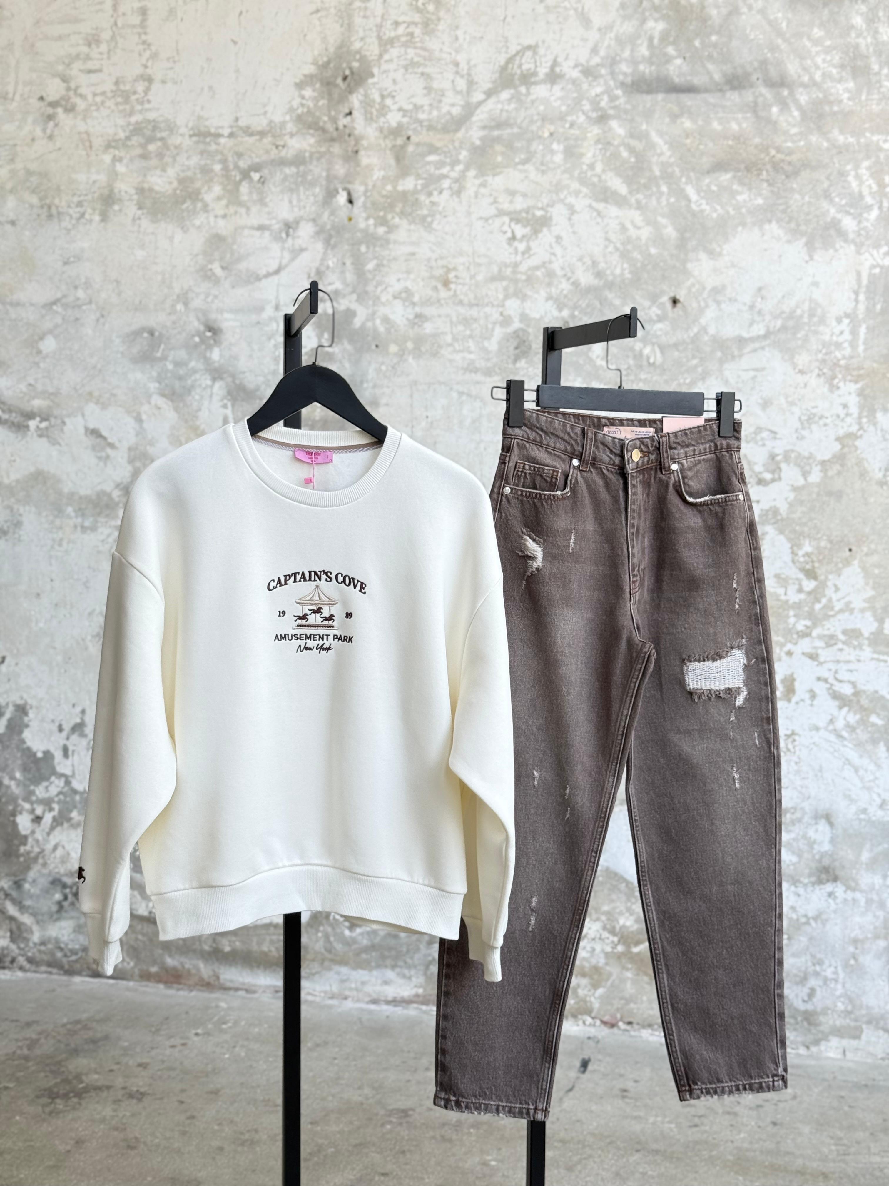 Eskitme Görünümlü Yırtık Detaylı Mom Jean (Kahverengi)