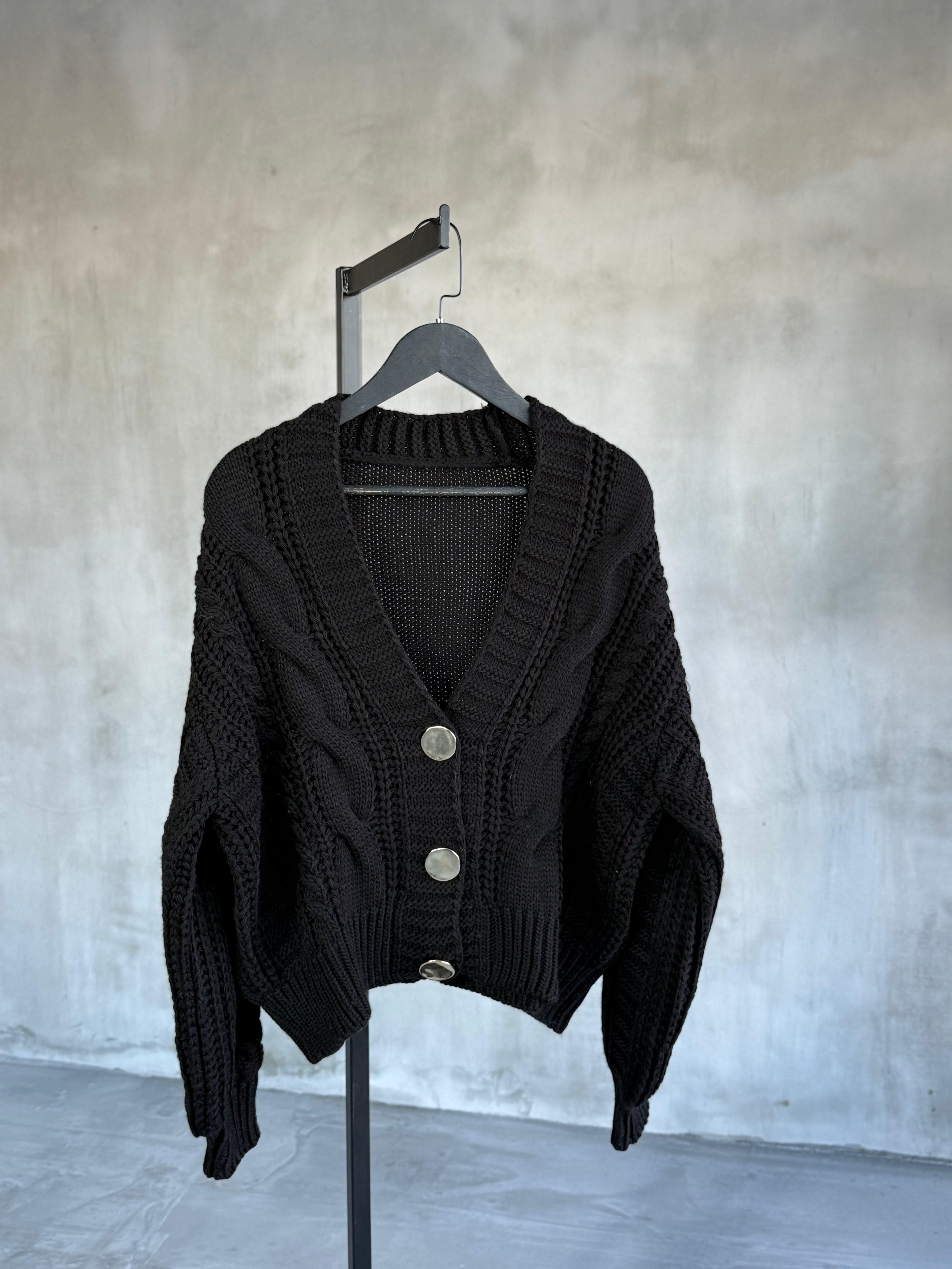 Gol Düğme Detaylı Çelik Örme Hırka (Siyah)