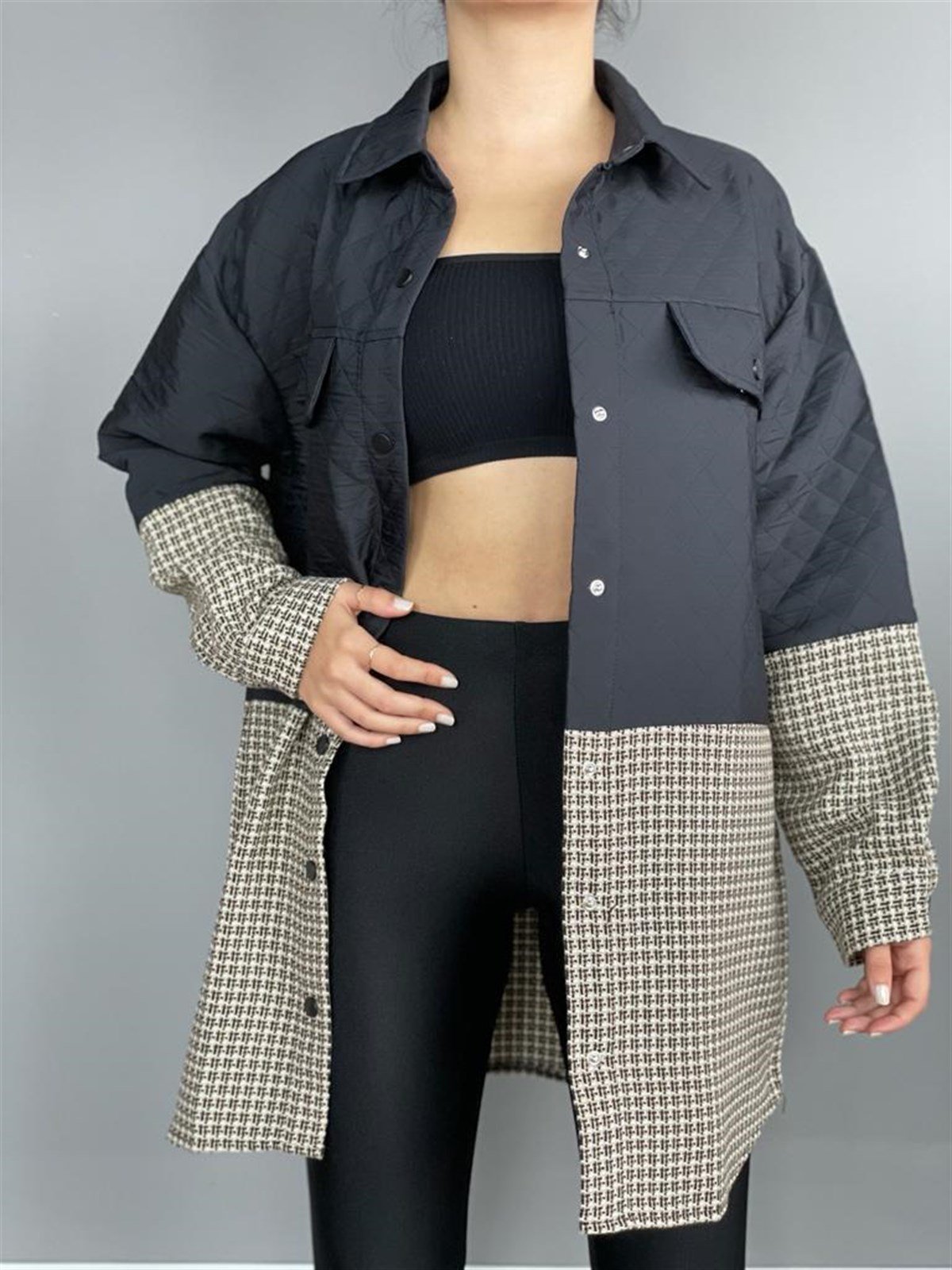 Kapitone Kumaş Kaz Ayağı Desenli Ceket (Siyah)