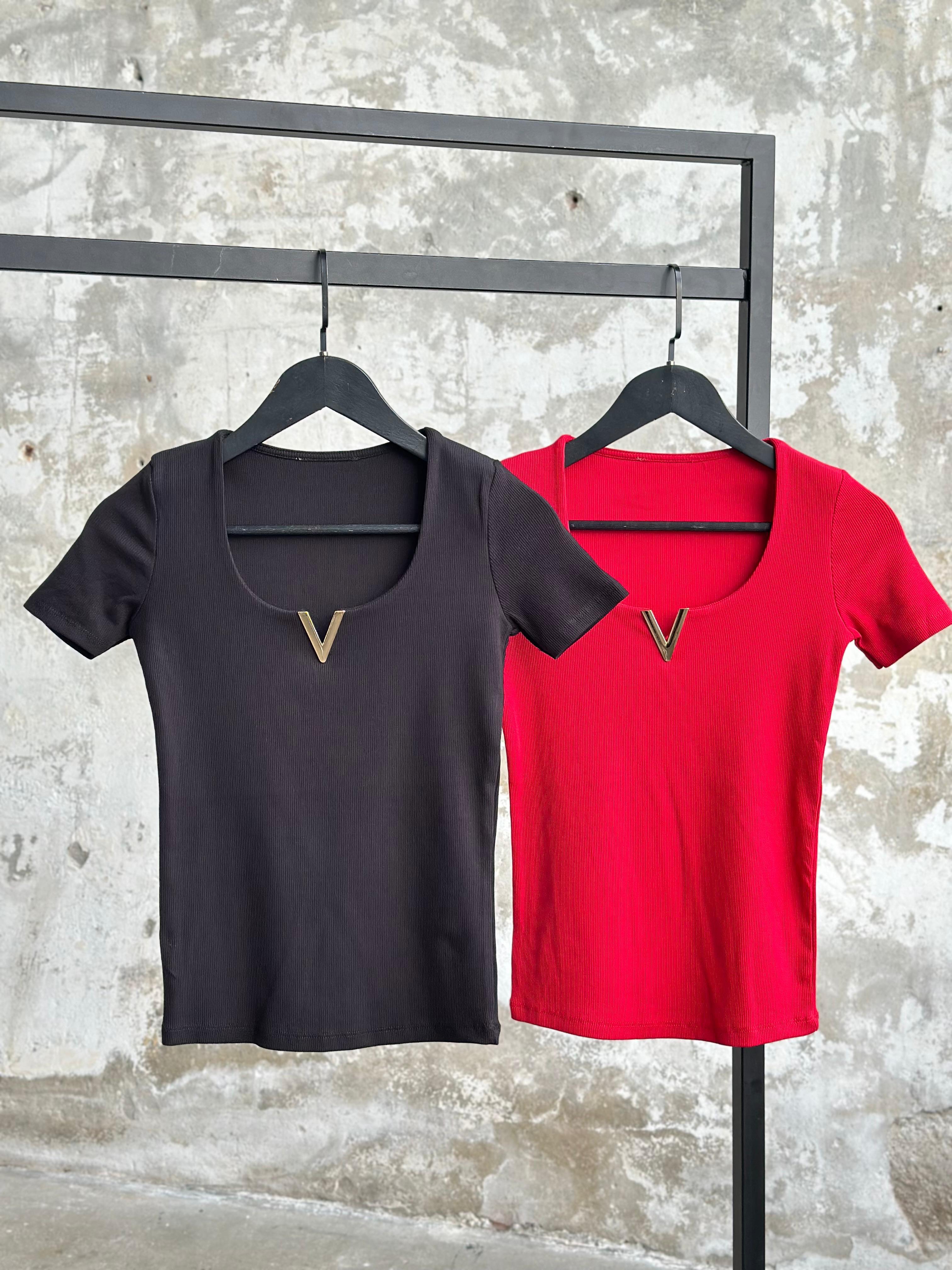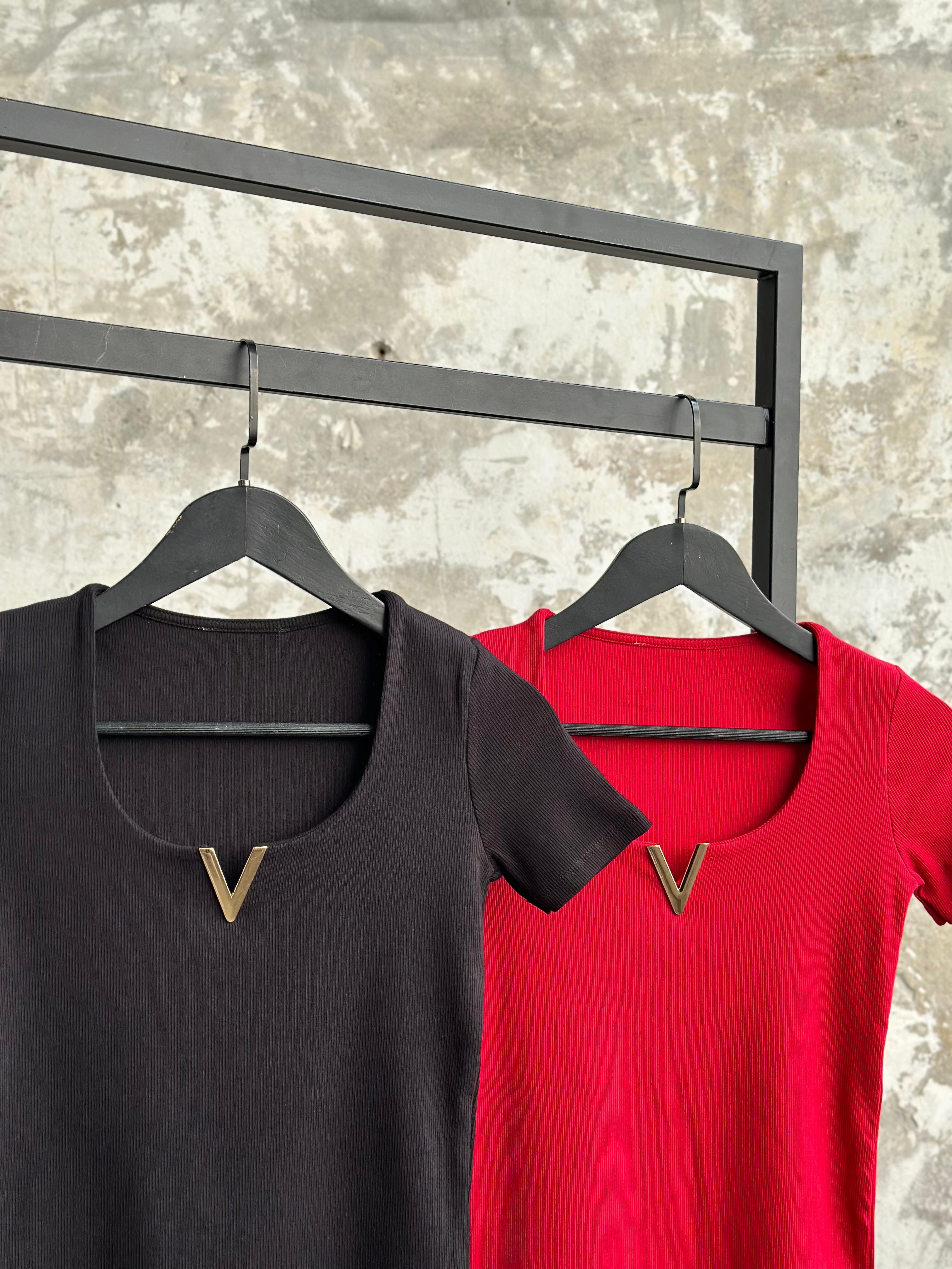 Kare Yaka Gold Detaylı Bluz (Siyah/Kırmızı)