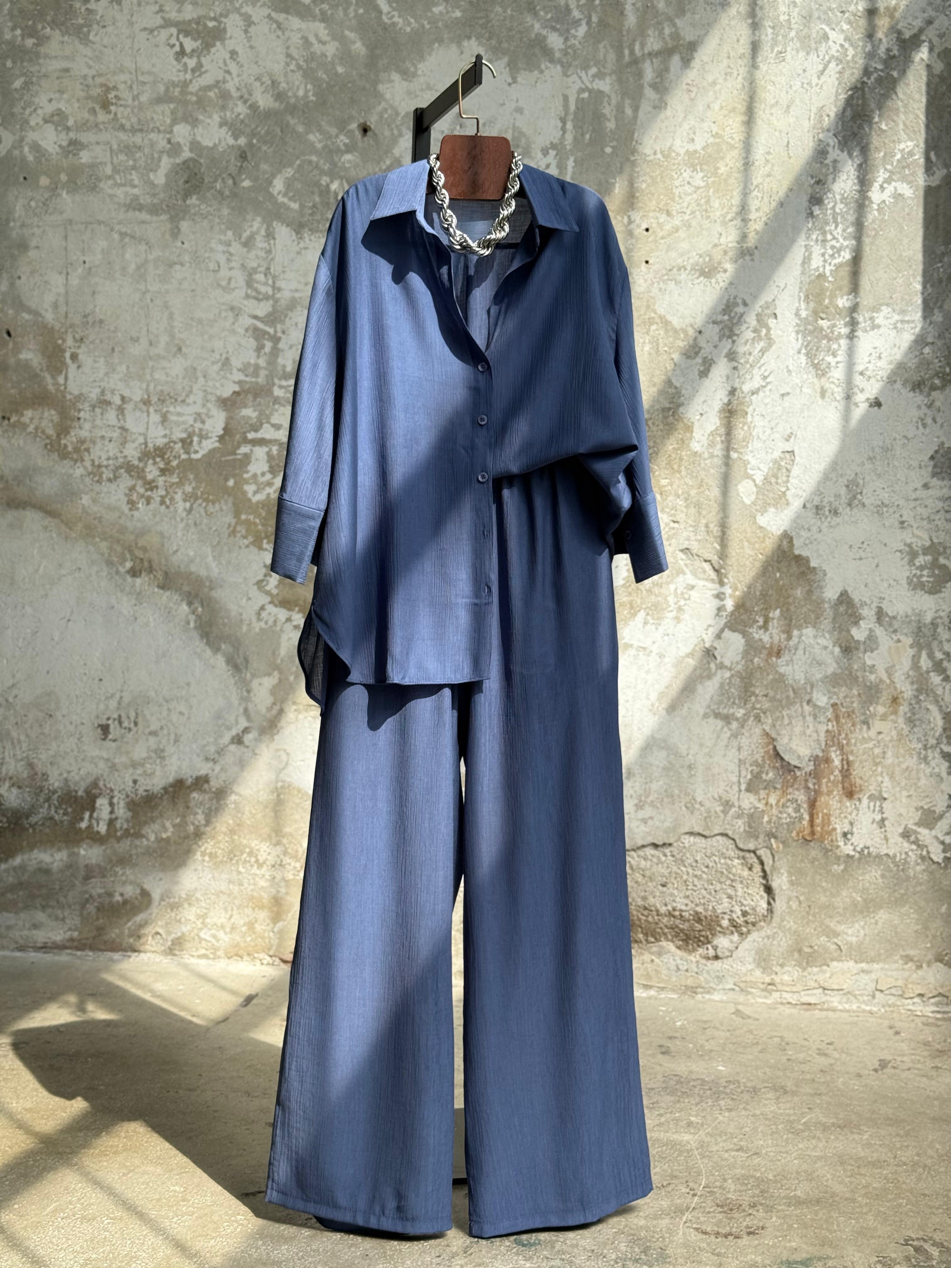 Detaylar • Dokulu, hafif ve nefes alabilen kumaş • Rahat kalıp, salaş tasarım • Elastik bel, geniş paça pantolon • Önü düğmeli, dökümlü gömlek • renk seçeneği: Kahve, indigo, siyah,