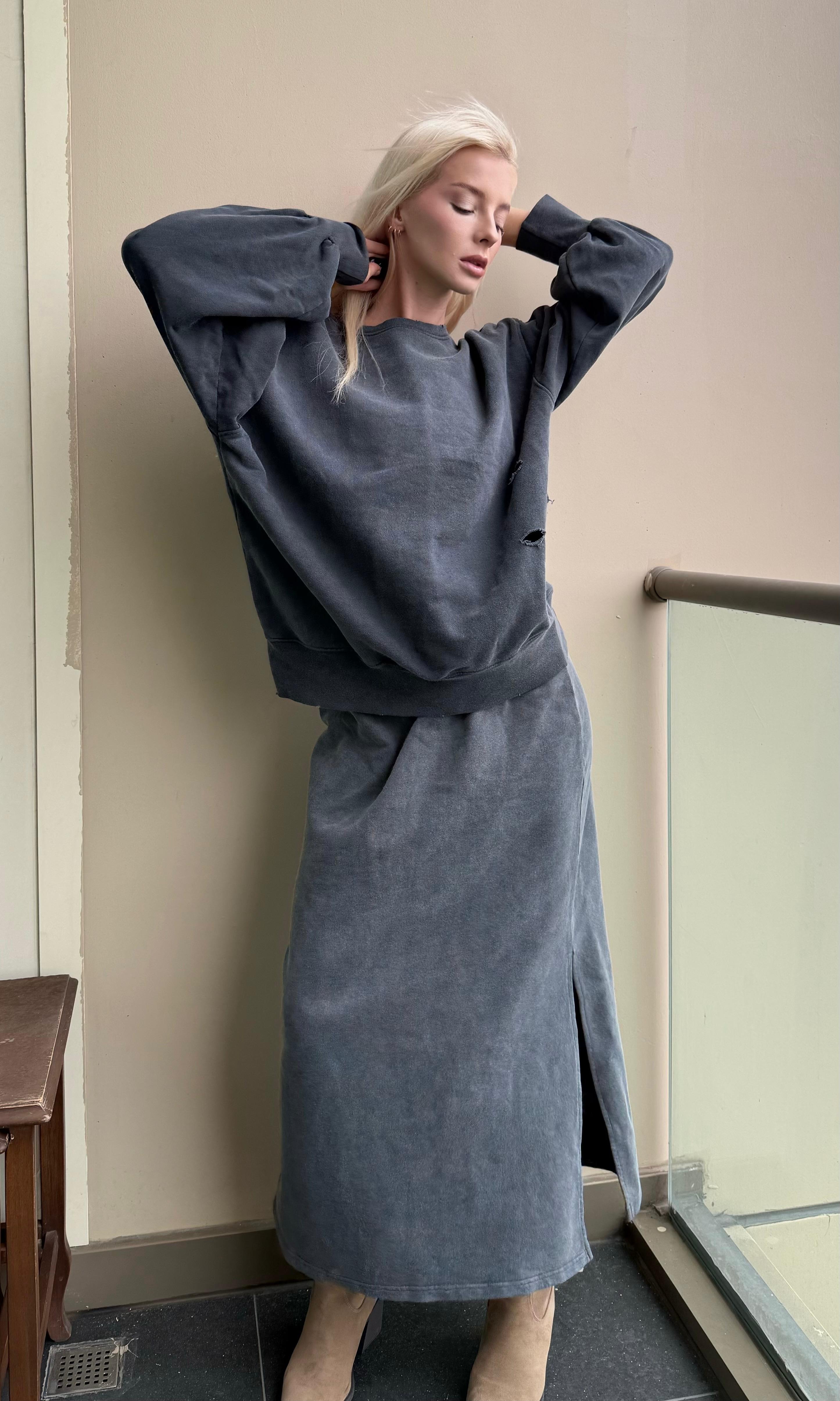 Taş Yıkamalı Yırtmaç Detaylı Etek (Gri)