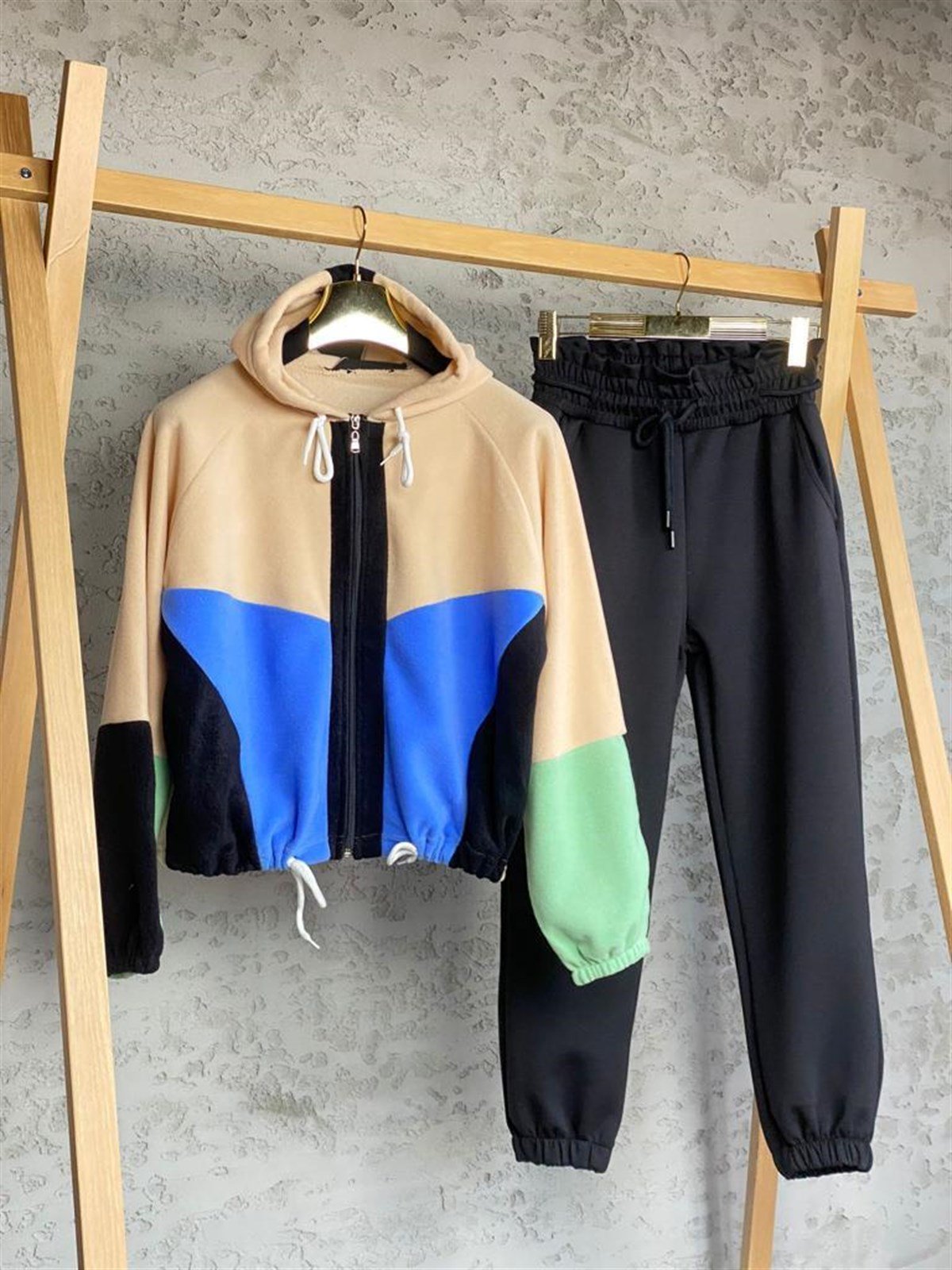 Tasarım Kapüşonlu Polar Ceket (Ekru)