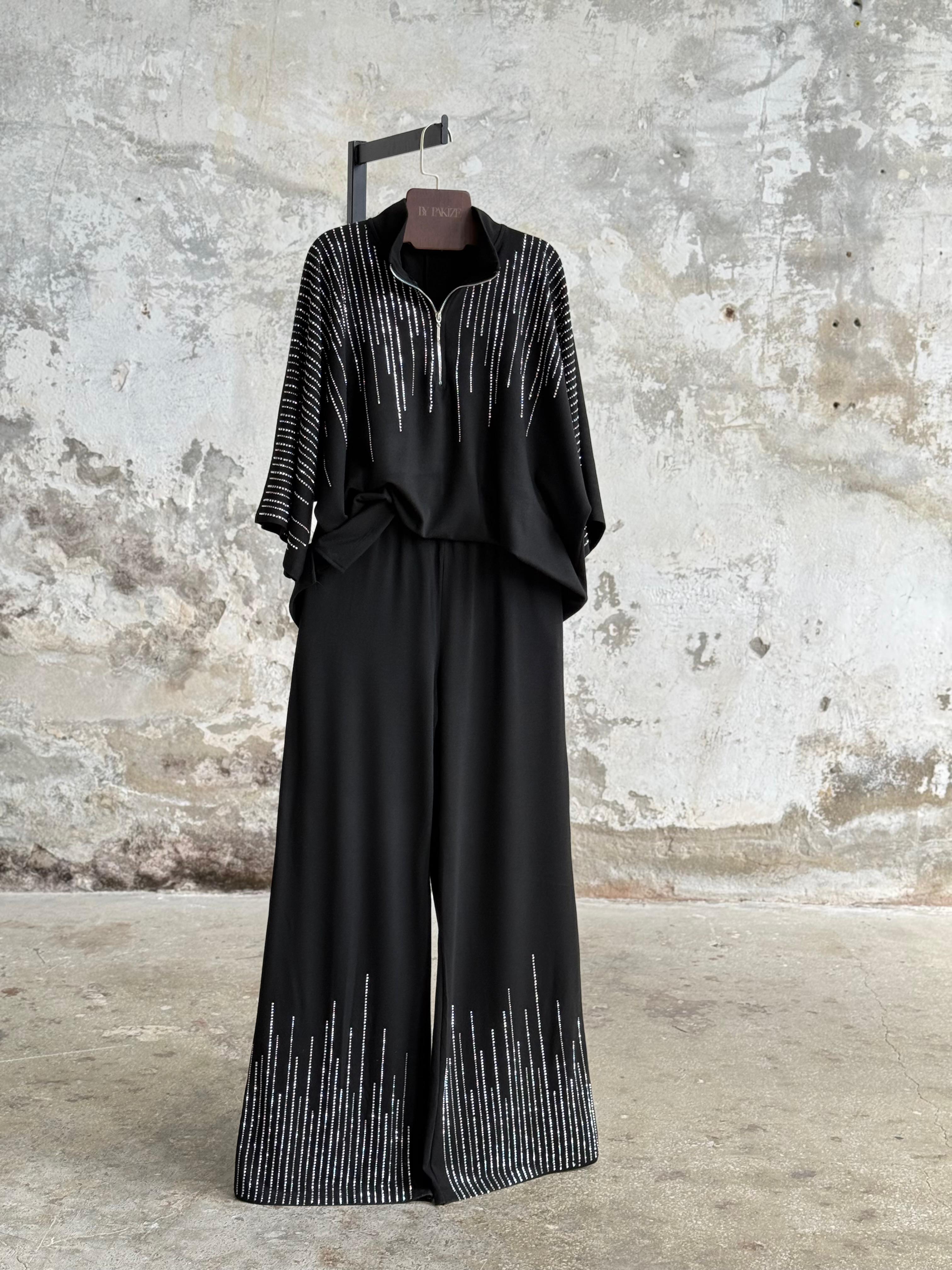 Tasarım Kristal Taş işçilikli Çilek Kumaş Takım (Siyah)