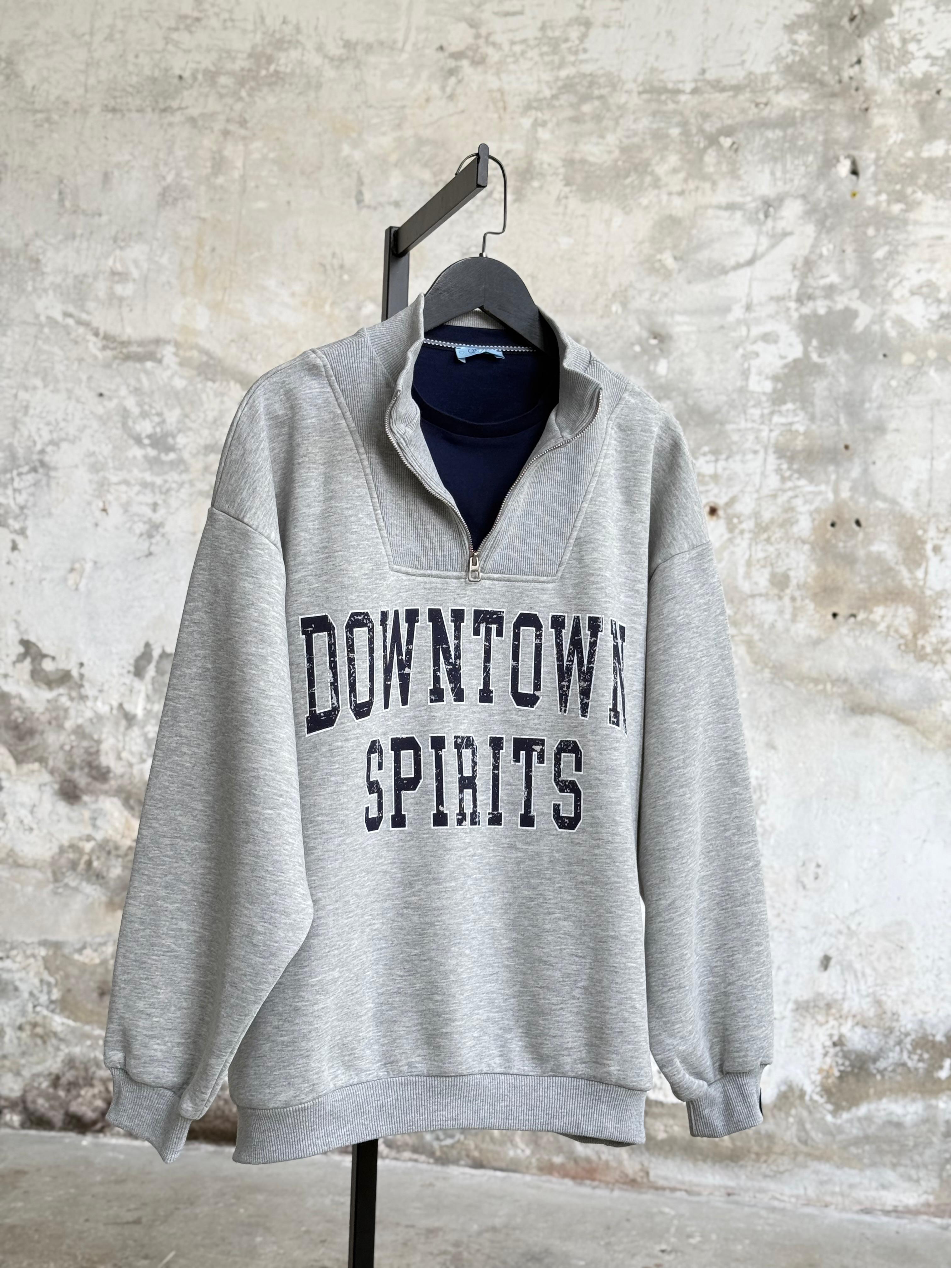 Yarım fermuarlı yaka detaylı, ön kısmı yazı baskılı, içi ardonlu, tişört görünümlü yakası sabit, uzun kollu, ribanası etiket detaylı oversize sweatshirt.