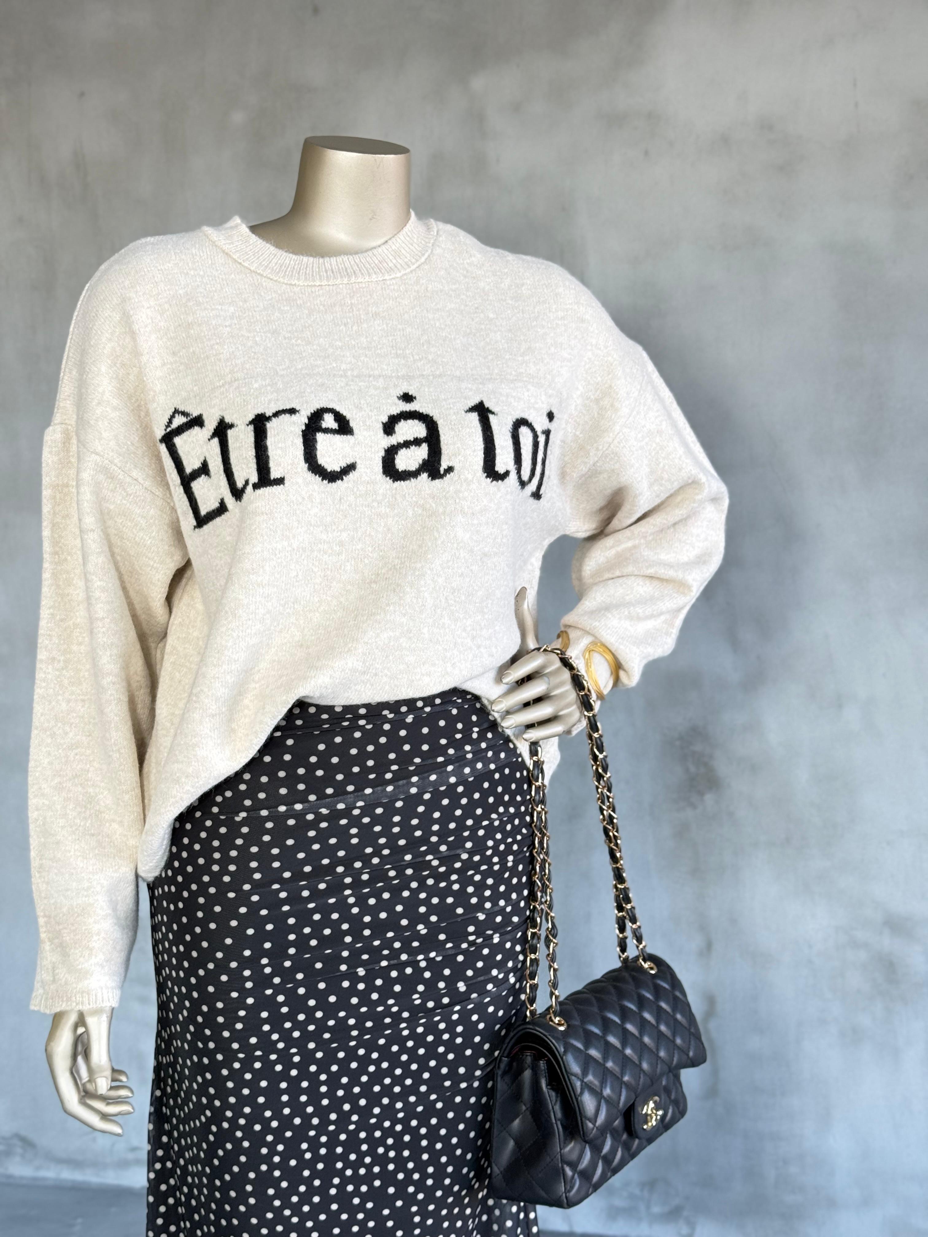 Ön kısmı yazı detaylı, bisiklet yaka, düşük omuz kesimli, uzun kollu, modern görünüm sunan düz kesim triko kazak.