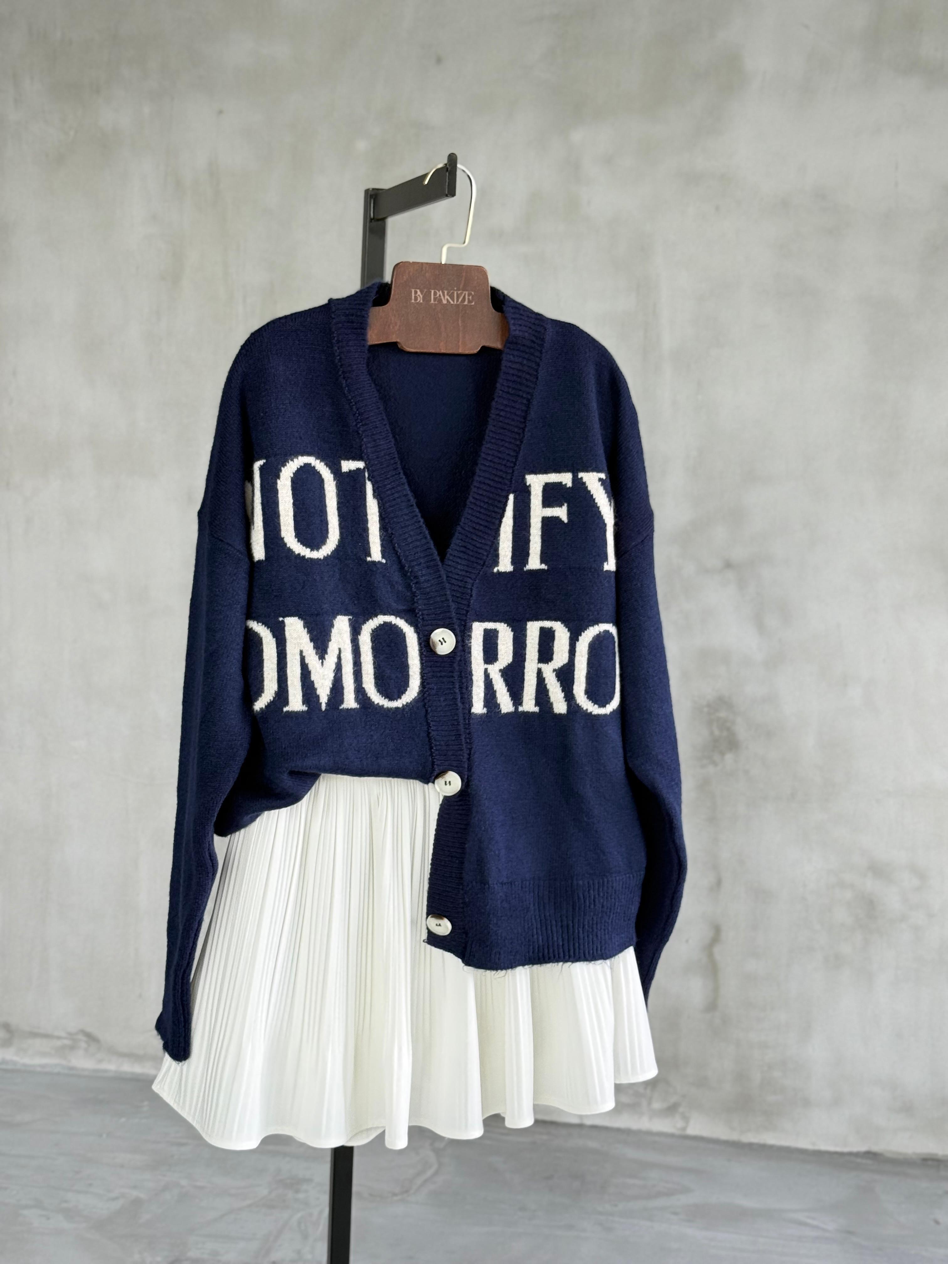 Yazı Desenli Düğmeli Oversize Triko Hırka (Lacivert)